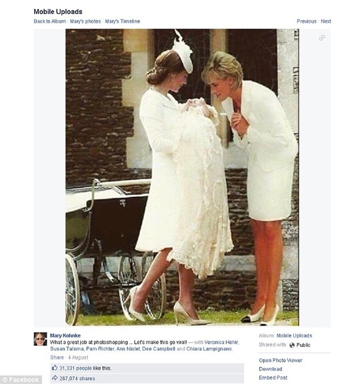 الصورة تم تركيبها عبر برنامج "فوتوشوب" لكن لم يعرف صاحب الفكرة، إلا انه جمع بين صورة للأميرة ديانا تتبارك من الام تريزا عام 1997 وصورة للاميرة شارلوت بحضن امها كايت اثناء عمادتها.