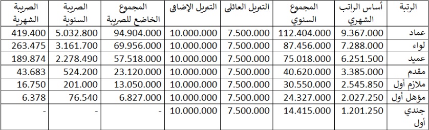 اليكم كيف أصبحت ضريبة الدخل بحسب الشطور بالنسبة للعسكريين المتقاعدين: