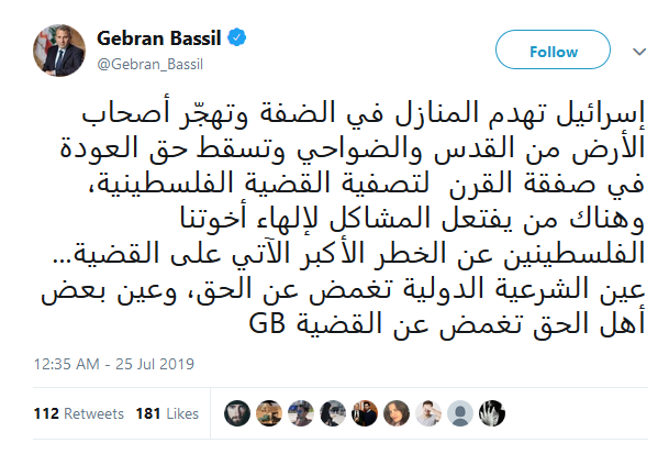 شدد وزير الخارجية والمغتربين جبران باسيل في تغريدة على حسابه عبر "تويتر" على أن "إسرائيل تهدم المنازل في الضفة وتهجّر أصحاب الأرض من القدس والضواحي وتسقط حق العودة في صفقة القرن لتصفية القضية الفلسطينية، وهناك من يفتعل المشاكل لإلهاء أهلنا الفلسطينيين عن الخطر الأكبر الآتي".