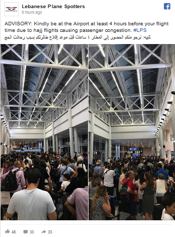 نشرت صفحة Lebanese Plane Spotters على "فايسبوك" صوراً لزحمة المسافرين في مطار بيروت. وعلّقت قائلة: "تنبيه: نرجو منكم الحضور إلى المطار 4 ساعات قبل موعد إقلاع طائرتكم بسبب رحلات الحج".