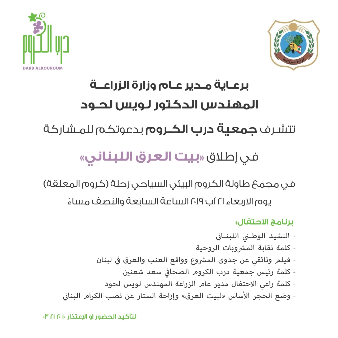 الأربعاء في ٢١ آب سيكون للذوق والأصالة عنوان من خلال وضع حجر الأساس لبيت العرق اللبناني وإزاحة الستارة عن نُصب الكرّام اللبناني في مجمع طاولة الكروم البيئي السياحي من تنظيم جمعية " درب الكروم " بالتعاون مع مدير عام الزراعة المهندس لويس لحود وسط حشدٍ من أهل الإعلام والمعنيين بالقطاع وذوي الخبرة والإختصاص ، والذواقة.