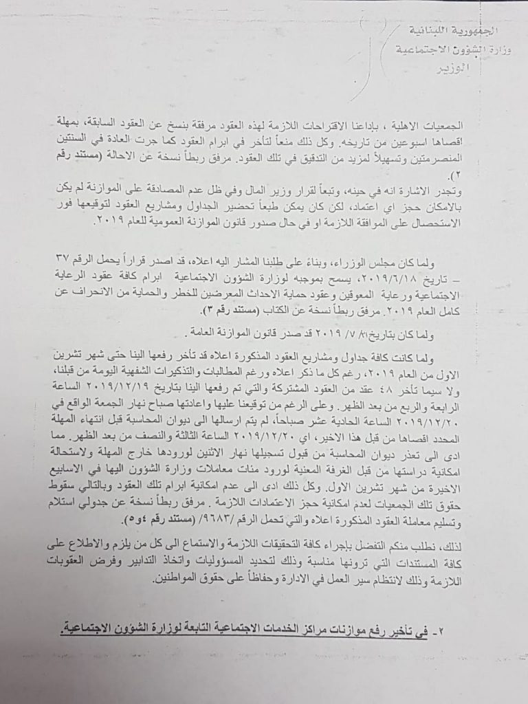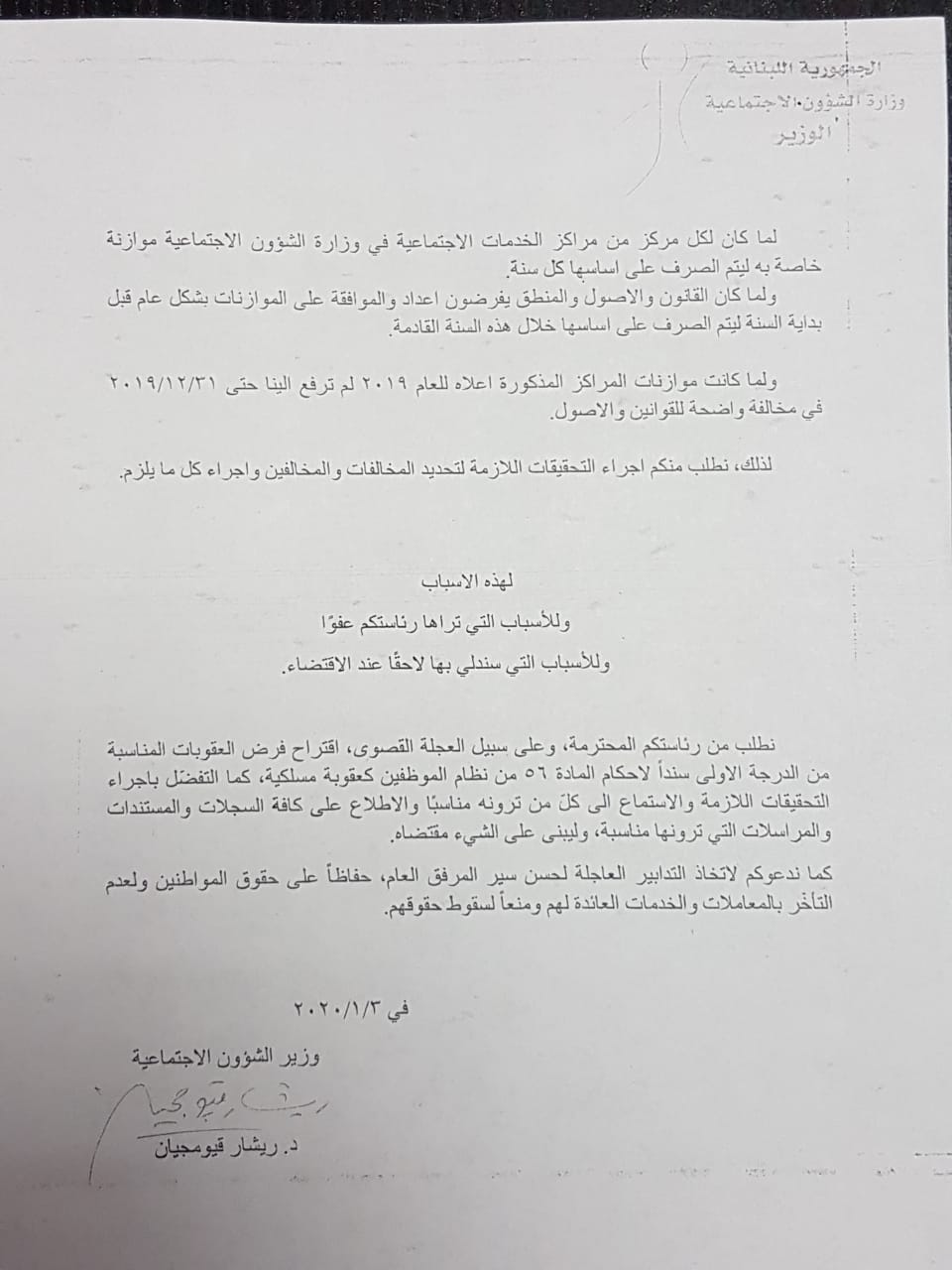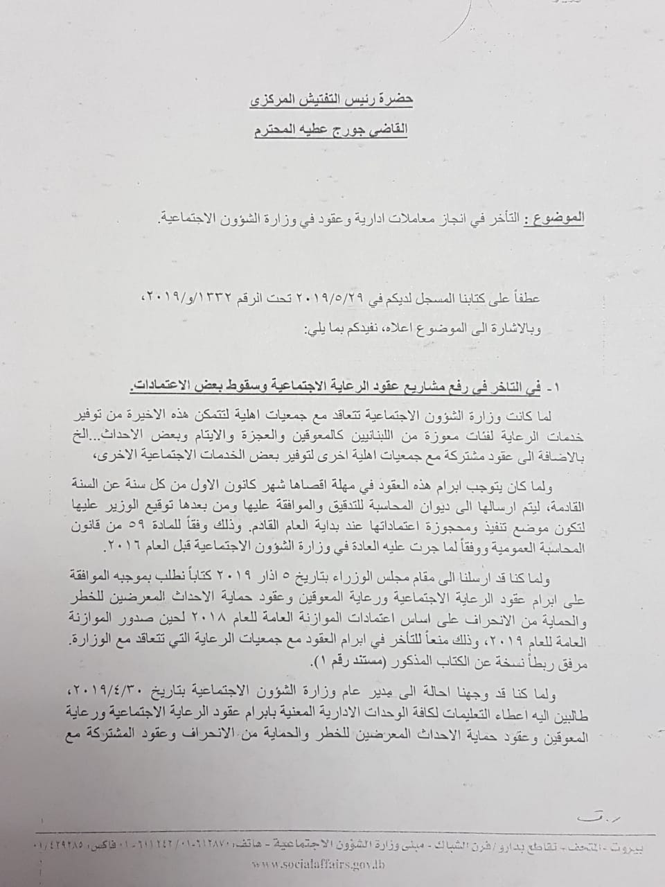 أوضح مدير مكتب وزير الشؤون الاجتماعية المحامي انطوني نشار، خلال اعتصام موظفي اللجان المشتركة في وزارة الشؤون الاجتماعية احتجاجا على عدم دفع رواتبهم، أن الوزير ريشار قيومجيان حوّل الملف الى التفتيش المركزي، مشيرا الى كتاب وجهه الوزير إلى رئيس التفتيش المركزي القاضي جورج عطيه لفتح تحقيق في موضوع التأخر في انجاز معاملات إدارية وعقود في الوزارة.