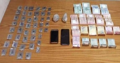 /44/ مظروفا بداخلها مادتي باز الكوكايين وكوكايين كريستال، وقطعتي حشيشة، ومبلغ من المال وهاتف خلوي.