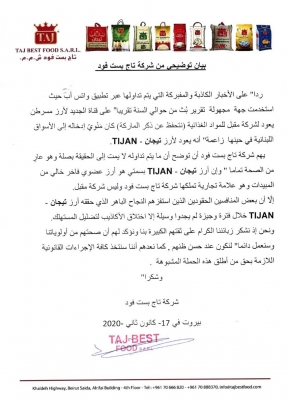 ردا" على الأخبار الكاذبة والمفبركة التي يتم تداولها عبر تطبيق واتس أب حيث استخدمت جهة مجهولة تقرير بُث من حوالي السنة تقريبا” على قناة الجديد لأرز مسرطن يعود لشركة مقبل للمواد الغذائية (نتحفظ عن ذكر الماركة) كان مَنْوِيّ إدخاله إلى الأسواق اللبنانية في حينها زاعمة" أنه يعود لأرز تيجان - TIJAN.
