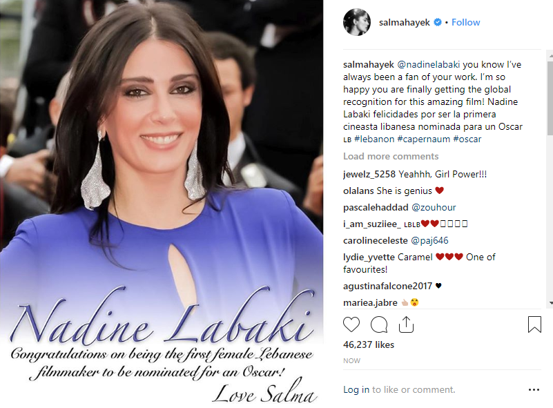 بلفتة مميزة، هنأت الممثلة المكسيكية من أصل لبناني سلمى حايك، المخرجة نادين لبكي، على ترشيح فيلمها كفرناحوم لجائزة الأوسكار.