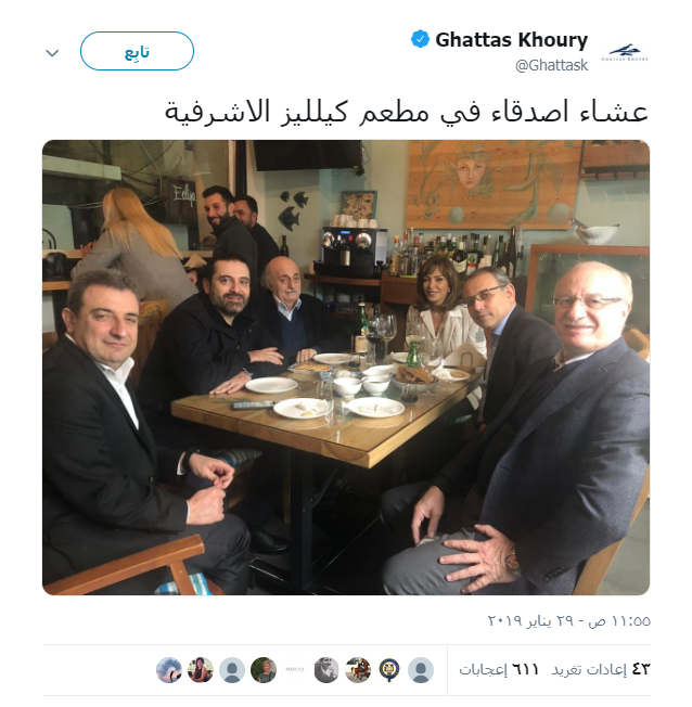 ونشر خوري الصورة في حسابه الخاص على تويتر وكتب "عشاء اصدقاء في مطعم ...الاشرفية".