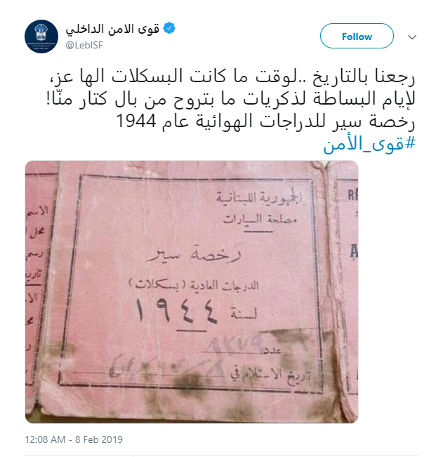 نشرت المديرية العامّة لقوى الأمن الداخلي على حسابها عبر تويتر، صورة لرخصة سيرٍ للدراجات العادية (بسكلات) صادرة عن مصلحة السيارات عام 1944.