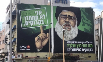 علقت في وسط تل أبيب لافتة ضخمة مع صورة الأمين العام لحزب الله اللبناني حسن نصر الله.