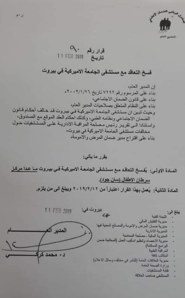 - القرار رقم 90 تاريخ 11 شباط 2019 ويتعلق بفسخ التعاقد مع مستشفى الجامعة الأميركية ما عدا مركز سرطان الأطفال ( سان جود) على أن يسري مفعول الفسخ إعتباراً من 12/ 2/ 2019.