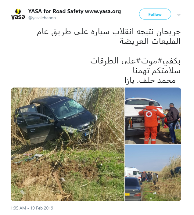 ونشرت جمعية اليازا على حسابها عبر "تويتر" صوراً للحادث، وعملت عناصر الدفاع المدني على نقل المصابين الى المستشفى للمعالجة.