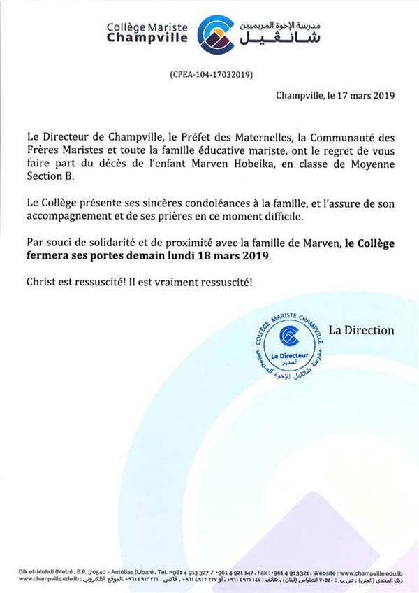 هزّت فاجعة جديدة أوساط الأهالي في لبنان، بعدما توفيّ طفل يدعى مارفن حبيقة في سنته الثالثة في مدرسة الأخوة المريميين – الشانفيل.