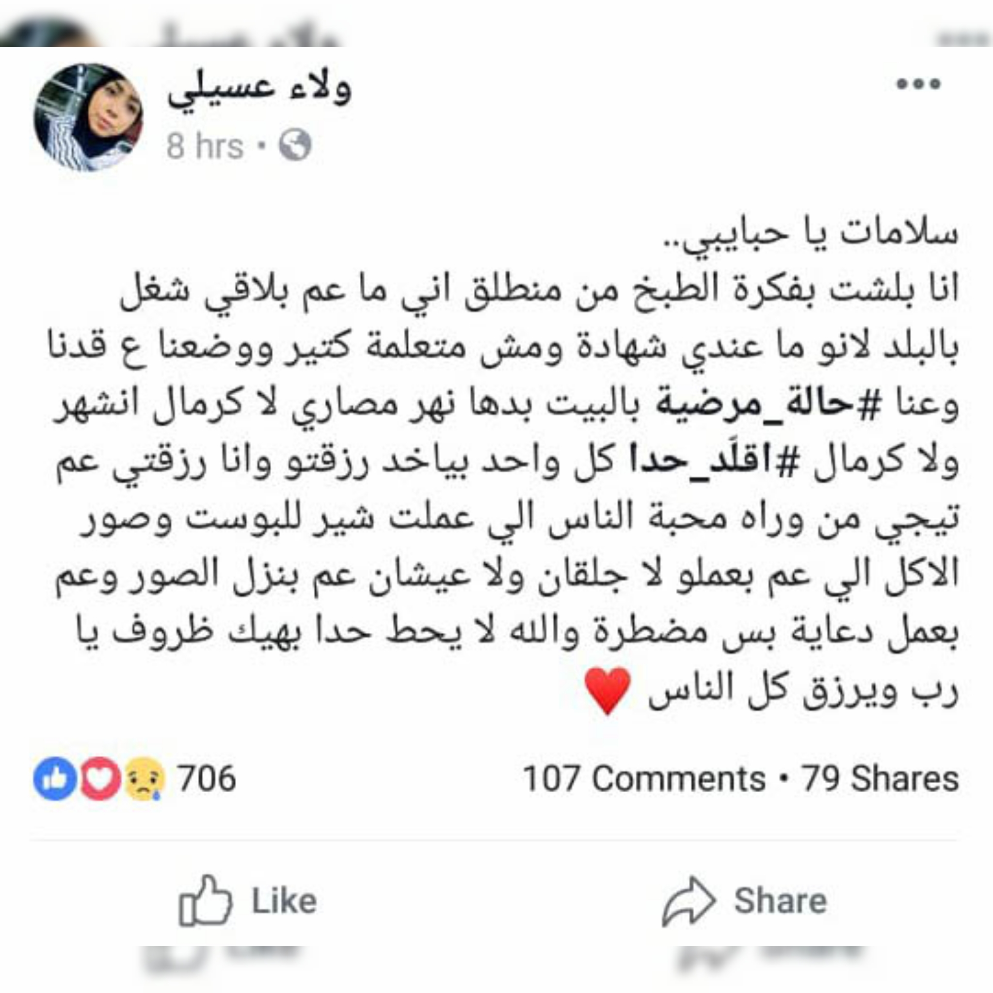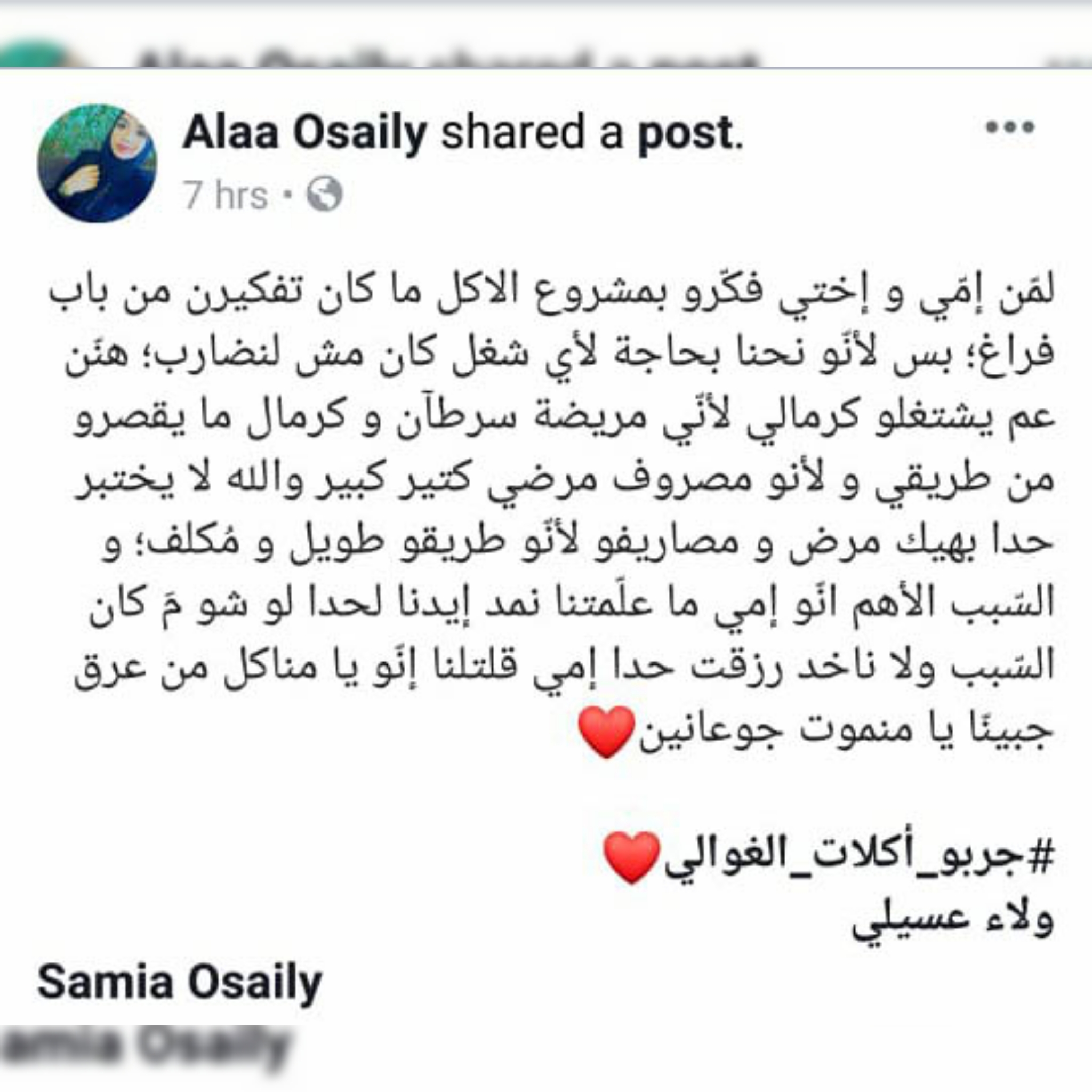 من يعيش مع مريض سرطانٍ يعرف تماماً كم هي رحلة هذا المرض طويلة ومكلفة وكم هي أعباؤها باهظة ولا تُحتمل. ولذلك، وبعد أن أشعلت الشابة آلاء عسيلي مواقع التواصل الإجتماعي بصمودها وبعد أن أخبرت الجميع قصتها من خلال الفيديو المصور , تحرّكت أختها الشابة ولاء عسيلي مع والدتهما سامية عسيلي بمبادرة مميزة للعمل على تأمين تكاليف علاج آلاء ولتحسين أوضاعهم المعيشية في الوقت نفسه. المبادرة هي عبارة عن أطباق يومية تقوم الشابة ولاء مع والدتها بطبخها حسب الطلب وبيعها بأسعار تناسب الجميع. وبحسب منشوراتٍ وضعتها الشابتان على صفحاتهما على فيسبوك فإن هذه المبادرة هي من أجل تأمين كلفة علاج آلاء ولأنهم لم يتعودوا يوماً أن يمدّوا يدهم للغريب.