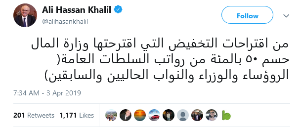 كشف وزير المال علي حسن خليل في تغريدة له على حسابه عبر تويتر، أن "من اقتراحات التخفيض التي اقترحتها وزارة المال حسم ٥٠ بالمئة من رواتب السلطات العامة (الرؤساء والوزراء والنواب الحاليين والسابقين)".