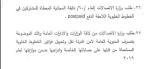 إنّ جدول أعمال جلسة مجلس الوزراء التي ستُعقد يوم غدٍ الخميس، يتضمّن في البند الـ26 طلب وزارة الإتصالات إلغاء 60 دقيقة المجانيّة المعطاة للمشتركين في الخطوط الخلوية اللاحقة الدفع Postpaid.