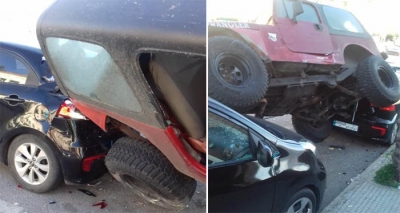نشرت "اليازا" على حسابها عبر تويتر، صوراً توثق لحظة "إجتياح "سيارة من "جيب"، لسيارتين مركونتين على جانب الطريق.